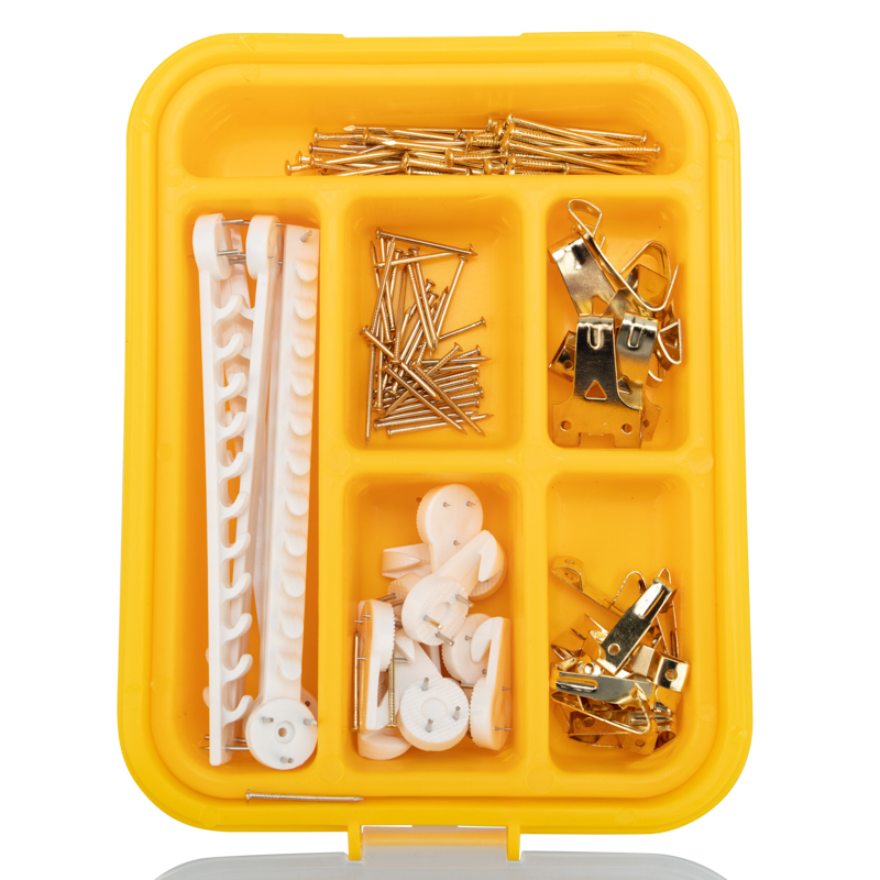 Набор состоит из 116 крепежных элементов, которых хватит для крепления сразу нескольких картин. Поставляется в пластиковом органайзере, который помогает не только удобно хранить изделия, но и быстро находить крепеж нужного размера. Органайзер может в дальнейшем использоваться для хранения других крепежных изделий.