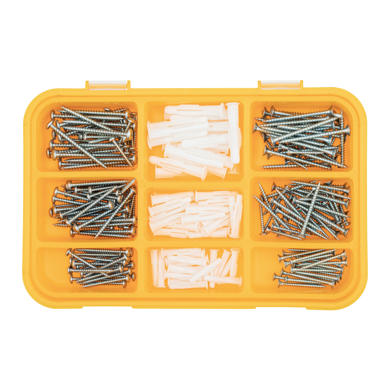 Набор состоит из 260 крепежных элементов, которых хватит для выполнения множества задач, поставляется в пластиковом органайзере, который помогает не только удобно хранить изделия, но и быстро находить крепеж нужного размера. Органайзер может в дальнейшем использоваться для хранения других крепежных элементов.