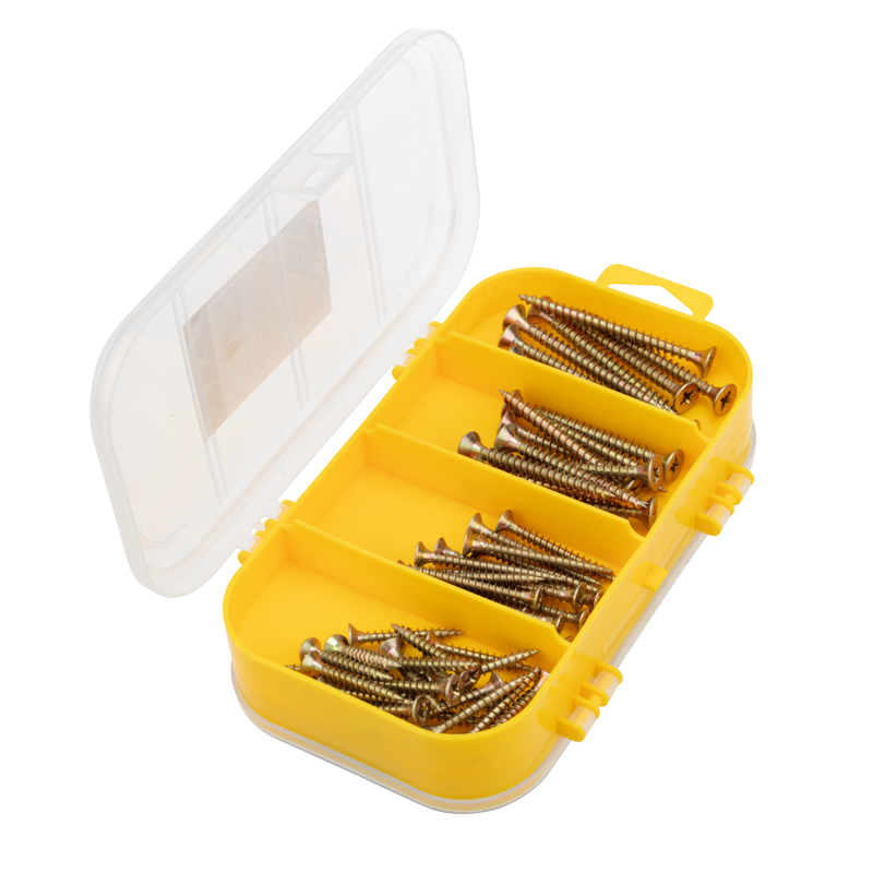 Стандартный набор состоит из 255 саморезов для ДСП, которых хватит для выполнения множества задач. Поставляется в пластиковом органайзере, который помогает не только удобно хранить изделия, но и быстро находить крепеж нужного размера. Органайзер может в дальнейшем использоваться для хранения других крепежных элементов.
