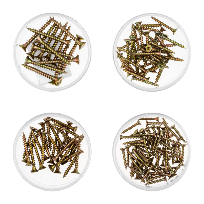 Набор состоит из 140 саморезов для ДСП, которых хватит для выполнения множества задач. Поставляется в практичном сборном пластиковом органайзере. Органайзер состоит из отдельных контейнеров, соединенных между собой с помощью винтовой резьбы, что упрощает хранение и организацию крепежа. Такой дизайн позволяет легко находить и использовать нужные саморезы и поддерживает порядок в крепеже. Органайзер может в дальнейшем использоваться для хранения других крепежных элементов.