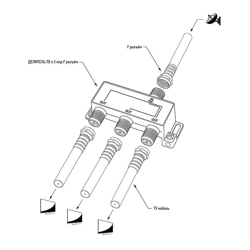 Данный ТВ сплиттер рассчитан под F разъём и имеет три выхода, т. е. сигнал, проходящий через сплиттер, делится на три части. Кабель подключается к этому делителю с помощью F-разъемов.