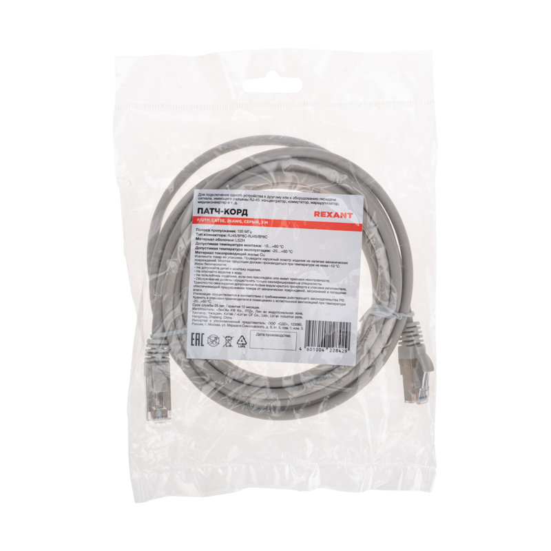 Патч-корд F/UTP, CAT 5e, RJ45-RJ45, 26AWG, LSZH, серый, 3м REXANT