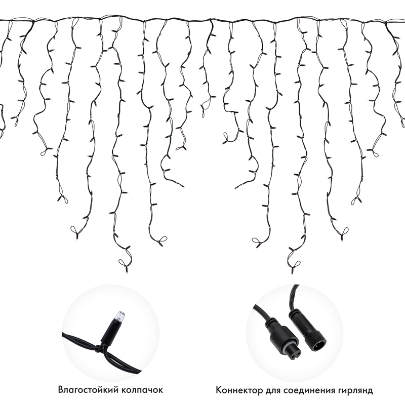 Гирлянда Айсикл (Бахрома) представляет собой гибкий горизонтальный шнур-шину, к которому через определенные промежутки крепятся вертикальные нити разной длины со светодиодами.
