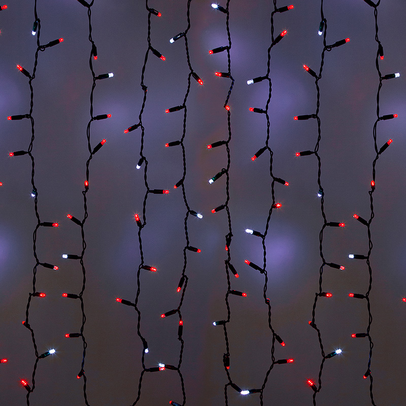 Светодиодная гирлянда Занавес (Дождь) представляет собой гибкий горизонтальный шнур-шину 2 м, к которому через определенные промежутки крепятся 20 вертикальных нитей равной длины со светодиодами.