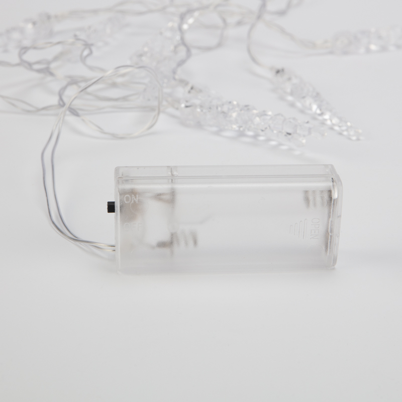 Светодиодная гирлянда «Сосульки» длиной 1,5 метра украшена пластиковыми насадками в виде ледяных сосулек, которые ярко подсвечиваются диодами. Украшение способствует созданию магической атмосферы праздника и помогает эффектно оформить интерьер. 10 сосулек расположены на расстоянии 16 сантиметров друг от друга, в качестве основы используется электрический кабель в надежной изоляции из прозрачного ПВХ. Диоды белого свечения питаются от двух батареек АА, которые помещаются в небольшой блок на конце кабеля. Безопасное изделие на батарейках — прекрасный вариант для оформления детской комнаты.