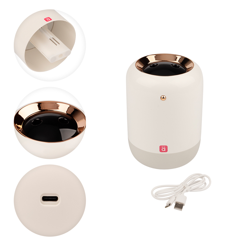 Увлажнитель работает как от USB, так и от встроенного аккумулятора (2400 мАч). Время работы составляет 3 часа при двойном распылении или 5 часов при одинарном распылении.