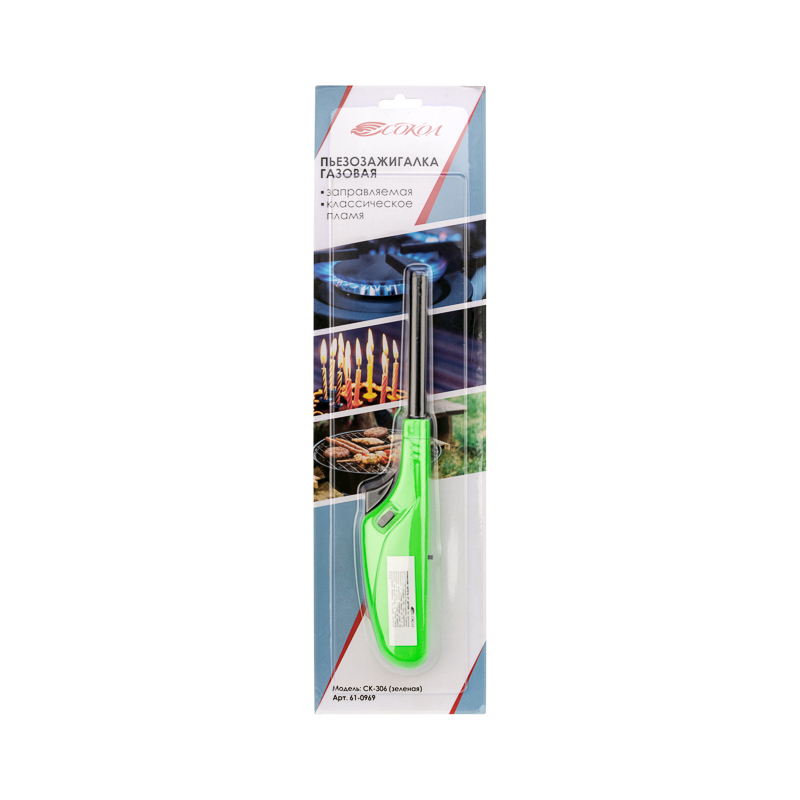 Бытовая газовая пьезозажигалка с классическим пламенем многоразовая (1 шт.) зеленая СК-306 СОКОЛ